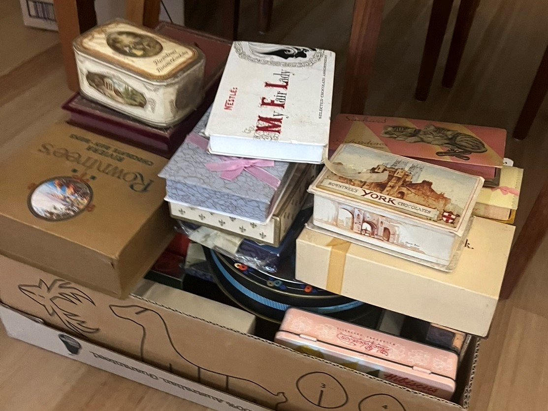 Chris Lynch September 2025 stall, tins, small packets, chocolate boxes