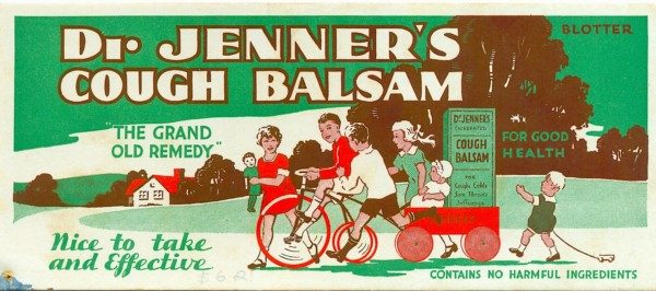 From the collection of Andrew H., whose interests include medicine, health and blotters. Dr Jenner’s cough balsam has been advertised since the start of the twentieth century. Points of difference about the product have changed over the years – the reference to ‘contains no harmful ingredients’ seems to date from the 1920s. Beautiful group of children with dolls, train on a rope and high socks. This is an unusual subject for a blotter as many were directed to those doing office work – promoting pens, insurance, suits and hats, fuel and tyres. There are subjects directed to the housewife and this health and children one fits in that category.