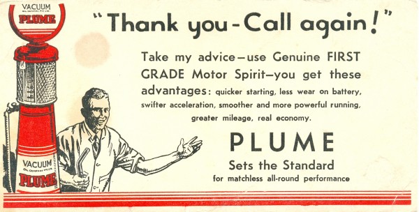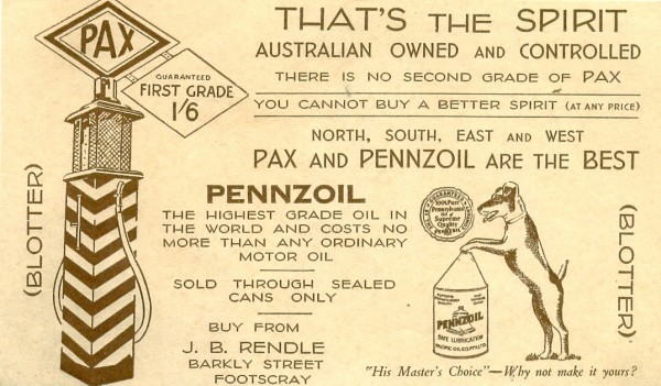 Another nice fuel blotter albeit very small. We found only three advertisements for ‘Pax’ and “Pennzoil’ and these were from 1938 and 1939; the latter was closest to the wording on the blotter. We like the stripey bowser and model dog.