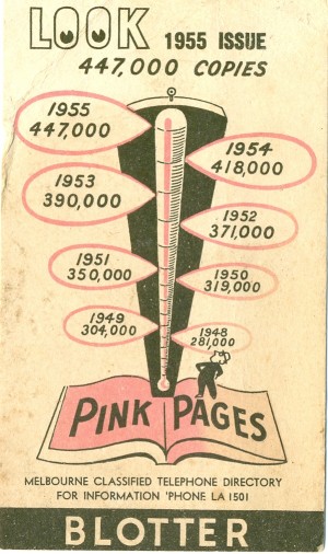 This blotter really was too small to be useful. Another portrait blotter, this time for the once ubiquitous Pink Pages. The population of Melbourne at that time was 1,569,000 so the business phone guide was in most homes and businesses. The telephone directory no doubt led to the demise of the Sands & McDougall street directories in 1974.