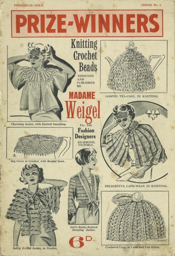 Prize-winners: knitting crochet beads designed and published by Madame Weigel Pty Ltd. Series no. 4. Stapled, 16 pages. 28 x 19 cm. Black and white with red on front cover only. Just sketches, no photographs. Just patterns. SLV says circa 1940s. see digital version.