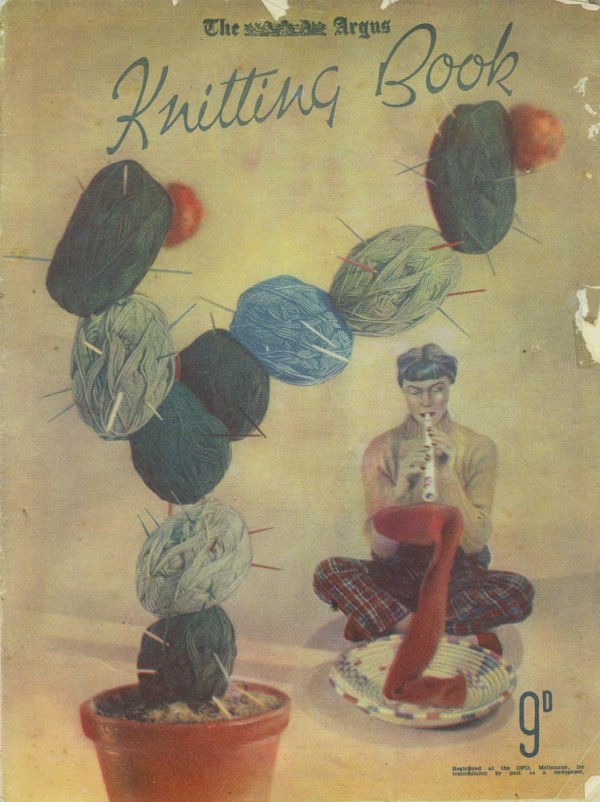 The Argus Knitting Book, stapled, 36 pages, with full colour cover and advertising insert only. Interesting and less serious and so more fun than the other pattern books. According to Trove this dates from circa 1940. We note that the knitter is pictured facing difficulties with the knitting – needs to tame the tangles and deal with prickly situations.