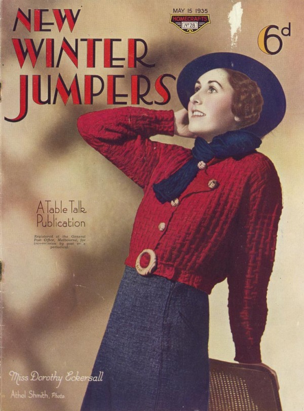 This cover is a quintessentially Melbourne product. Published as a part of a series, Homecraft, No. 28, by Table Talk. The cover and inside pages photographs of women wearing jumpers has some of the trademark Table Talk glamour; by this we mean professional photographs of young women about town – the ‘it’ girls of the time.