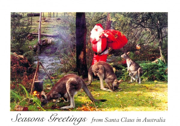 Here is a card that we have never been prepared to send across the seas to mark Christmas – Santa looks like he has come from outer space – he just doesn’t fit in the environment that the kangaroos are enjoying. Had this card for a while – might be from pre 1994 (the telephone number for the publisher Mackay Photographs Australia was 03 457. There was no ‘9’ starting the number and the ‘9’ was apparently introduced between 1994 and 1998.