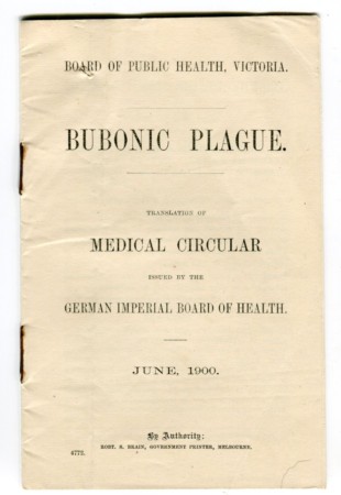 The Board of Health is now re-issuing a pamphlet, published by it in June, 1900, on the plague. This pamphlet is a translation by Dr. Gresswell and Dr. Schleicher of a medical circular issued by the German Imperial Board of Health on the subject. The circular describes the symptoms of the plague, which generally at tacks suddenly and is accompanied by severe constitutional pains. Inflammatory swelling of external lymphatic glands or a pustule, carbuncle or pneumonia may develop at the commencement, or may not be discovered until after death. It will be worth the while of householders to obtain a copy of tho pamphlet. Herald (Melbourne), Saturday 8 March 1902, page 4